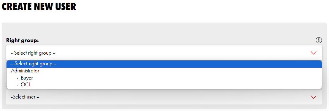 Under SELECT ACTION on the right hand side, all settings can be done and changed by an administrator. PLEASE NOTE: In order to prevent a user from editing his rights or budgets himself, the right group BUYER must be assigned.