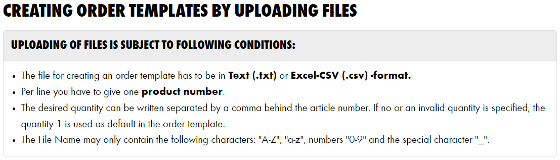 Requirements for uploading a file: • The file used to create an order template must be in the text (.txt) or Excel CSV (.csv) format • One item number may be specified per line. The item will appear in the order template with a quantity of 1.
